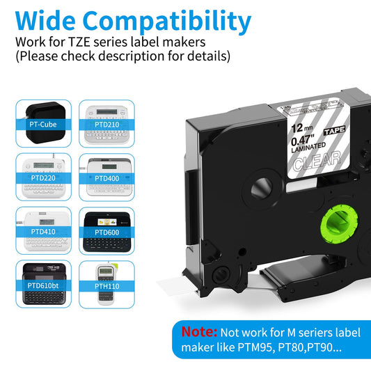 Replacement for Brother Label Maker Refills Clear P-Touch Label Tape 12mm 0.47 Inch TZ Laminated Black on Clear Tze-131 for PT D210 H110 1280 1750 1880 1890 Tape, 1/2 Inch x 26.2 ft, 5-Pack