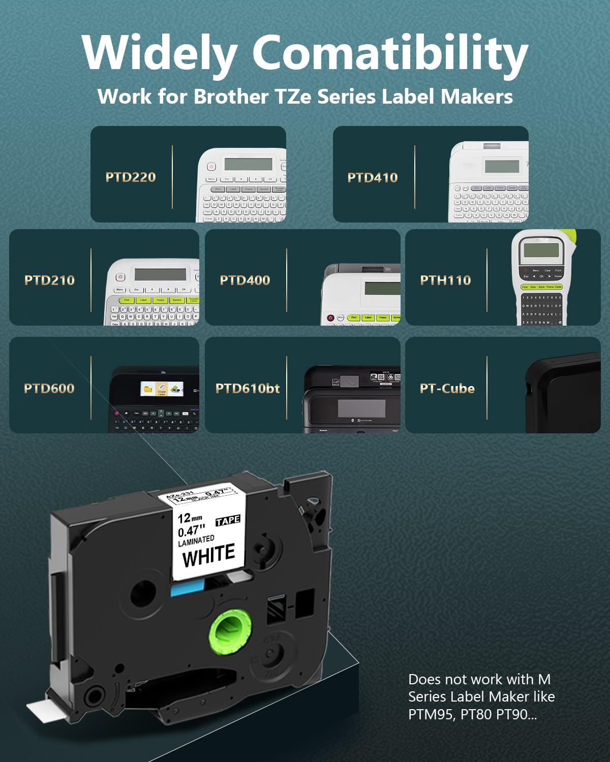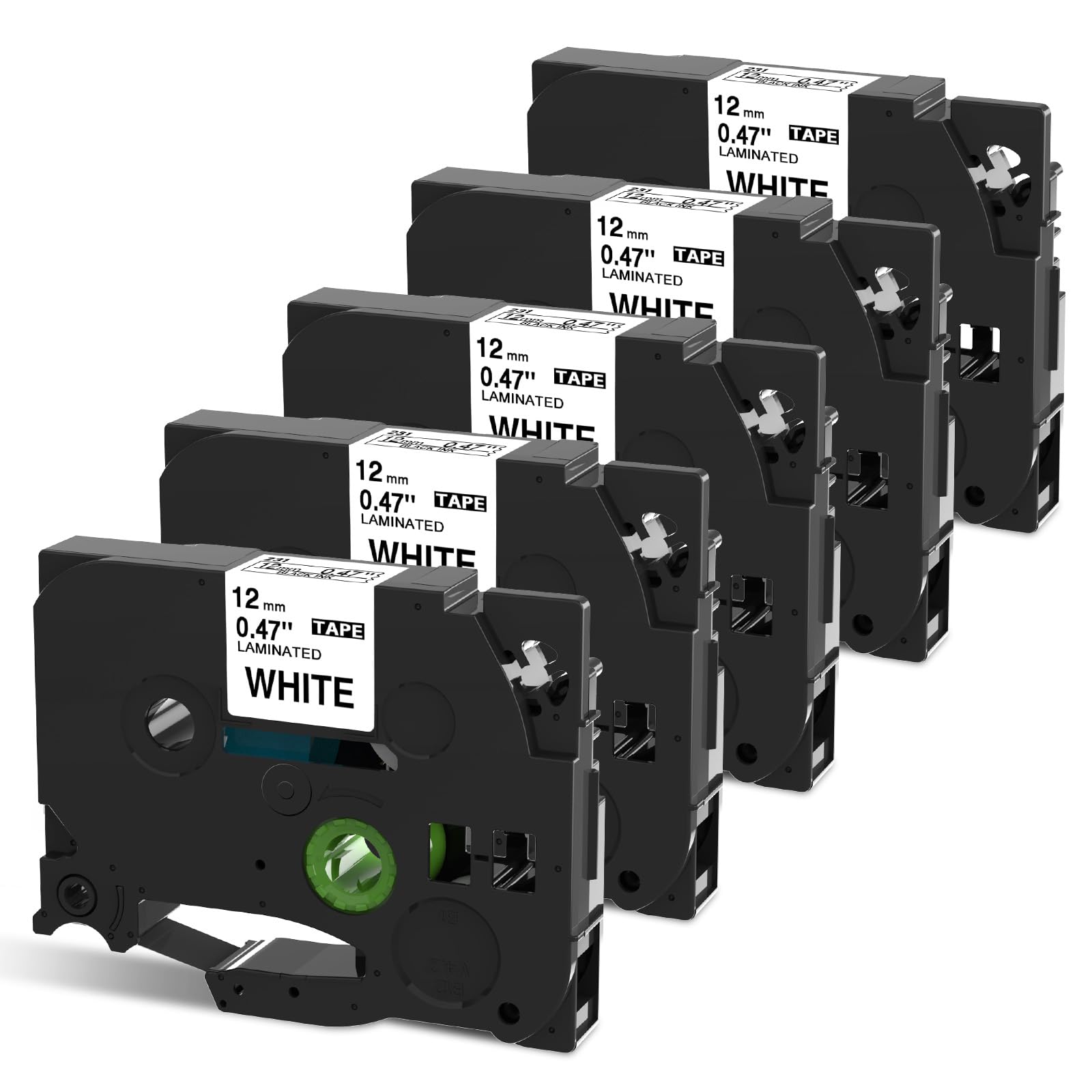 5 Pack Replacement for TZe-231 P Touch Label Tape Compatible with Brother P-Touch (TZ231 TZe231) Standard Laminated 12mm, Black on White, for Label Maker Tape PTH110 PT-D210 D220 D200 H100