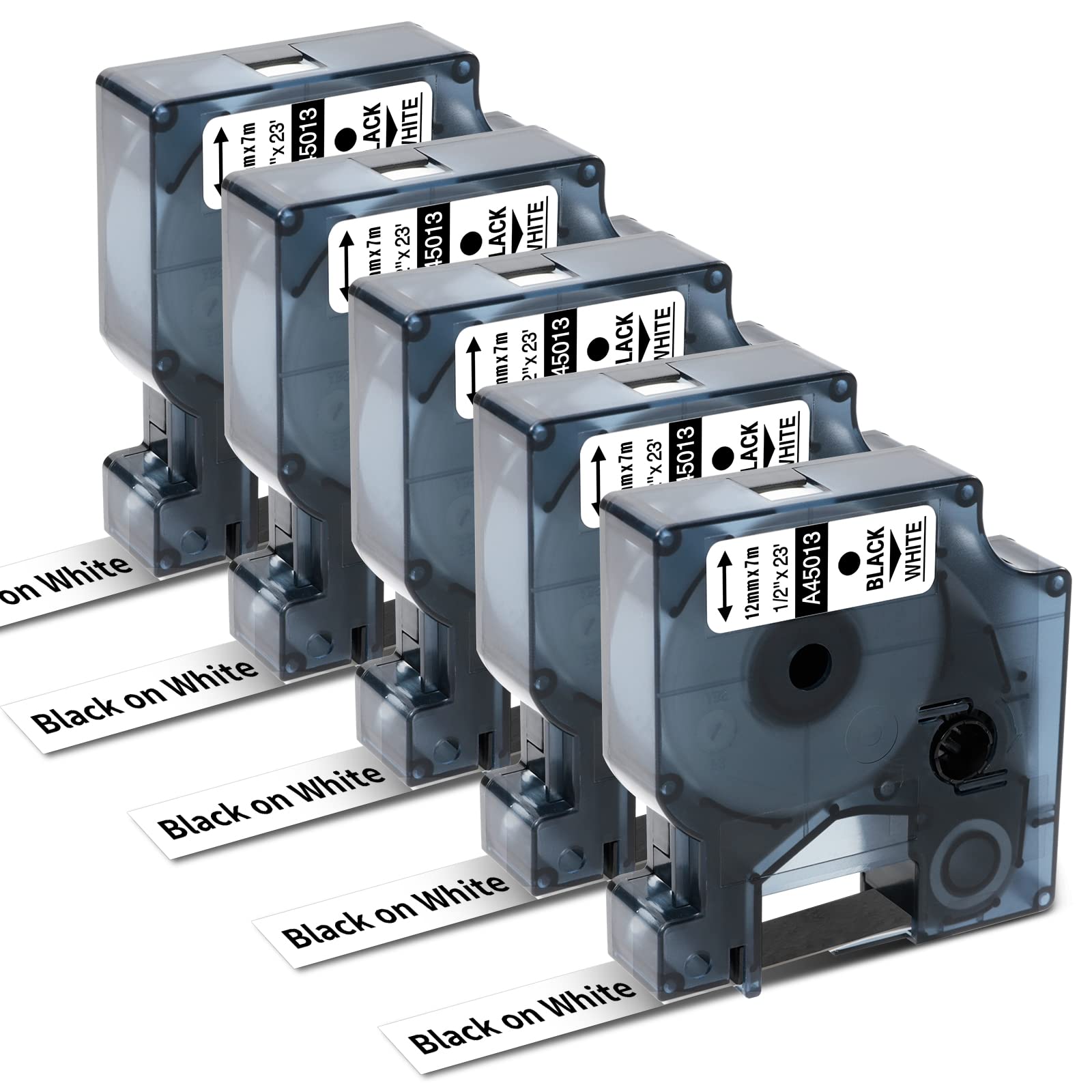 A45013 Nastro Oozmas Compatibile con Dymo D1 45013 12mm x 7m Nero su Bianco, Cartucce Label Cassette Compatibile con Dymo Label Manager LM160 LM210d LM260p LM280 LM360d, confezione da 5