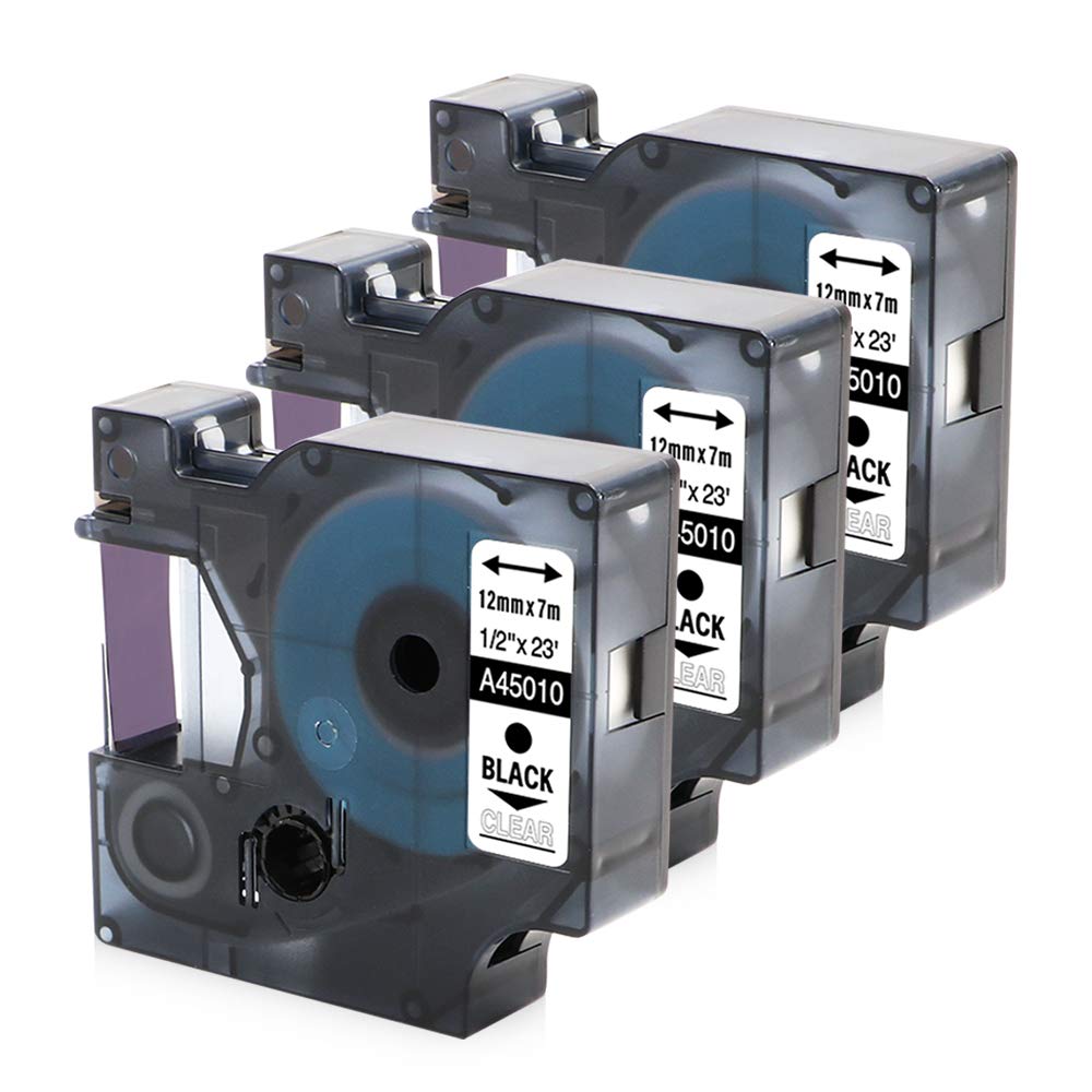 Compatible with Dymo Label Maker Refill Clear D1 45010 Label Maker Refill Cassette, Replacement for DYMO LabelManager 160, 210D, 450, 280, 420P, PnP, 220P, 360D Tapes, 1/2 Inch x 23 Feet, 3 Pack